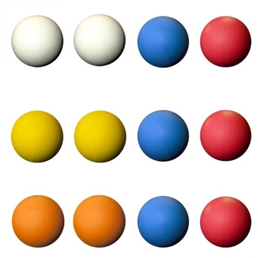 Dozen (12) assorted color myofascial therapy balls. Colors include white, red, orange, yellow, and blue.