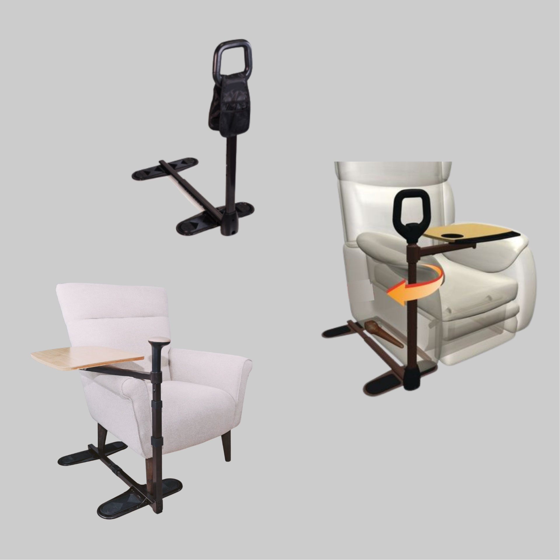 The Stander Couch Cane, Assist-A-Tray, and Omni Tray help you sit and stand safely from a couch or chair. Each has a strong support handle (holds up to 250 lbs) and adjusts to fit most furniture. The Assist-A-Tray and Omni Tray also include a swivel tray for meals, laptops, or reading—holding up to 30 lbs. All are easy to set up with no tools needed and great for daily use at home.