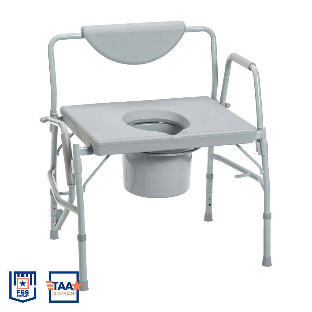 **FSS CONTRACT 36F79723D0003** Safe lateral transfers are ensured because of easy-release, drop-arm mechanism. White, powder-coated steel tubing is sturdy and easy to maintain. Also features large, durable snap-on seat, padded armrests and large backrest. Comes complete with 12-qt. commode bucket, cover and splash shield that removes from behind.